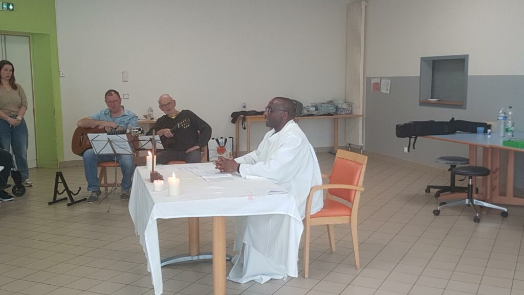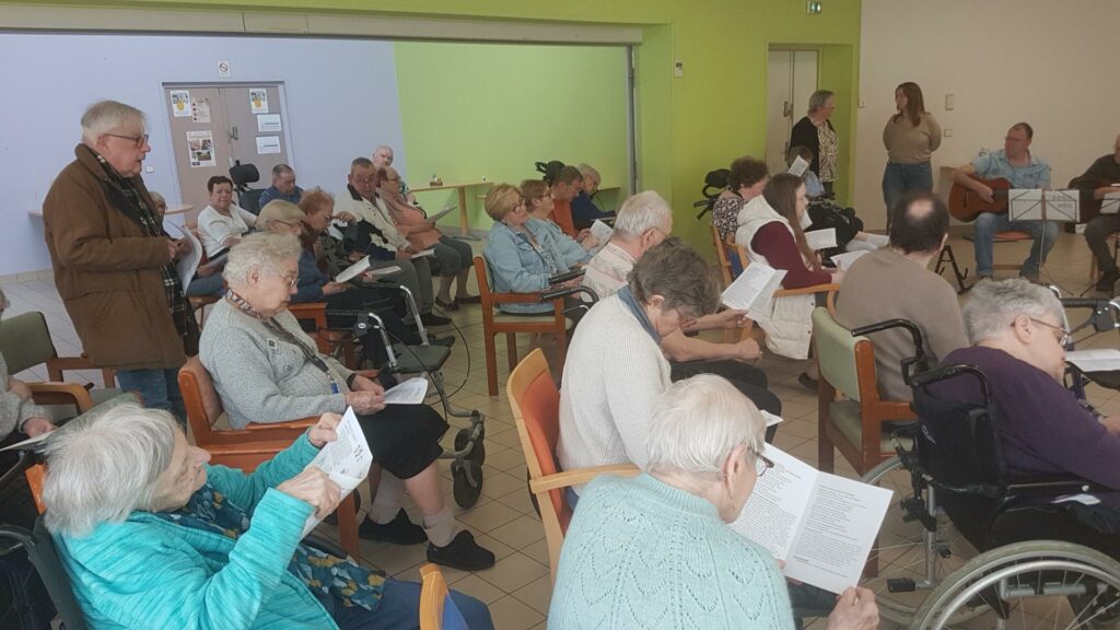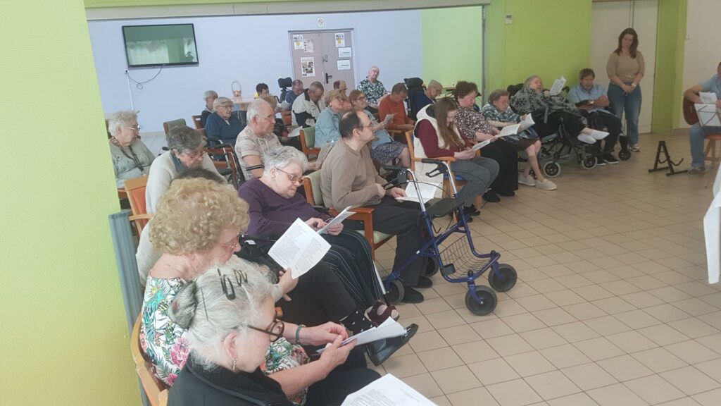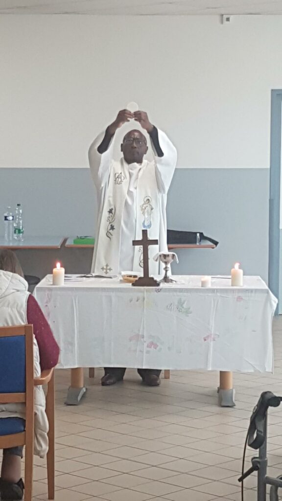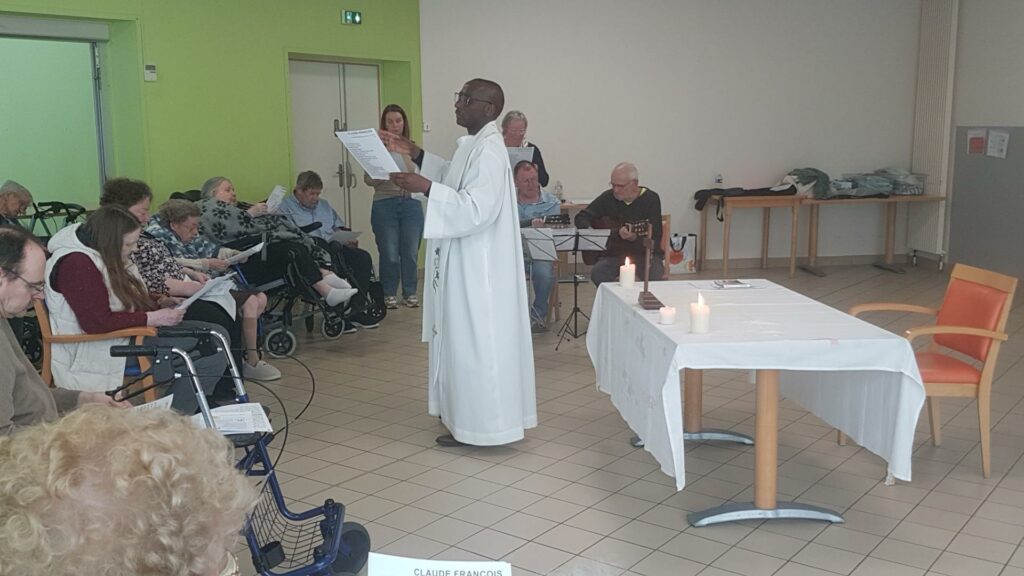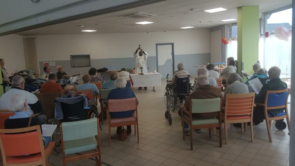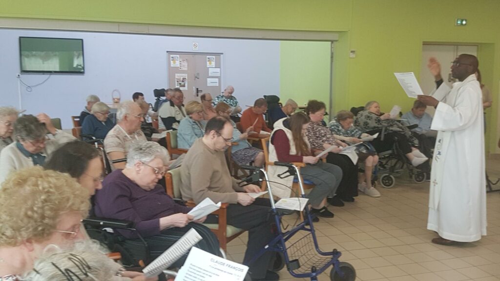 Une assemblée nombreuse pour célébrer La Résurrection de notre Seigneur à L’EPHAD d’Houplines. Le Père Cyriaque a demandé à l’assemblée de bien proclamer : « il est VRAIMENT réssuscité » ;il a également extrait quelques mots de l’Evangile du jour et a démandé aux résidents de bien les garder en mémoire;
